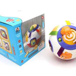 Muzička lopta sa tasterima. Zvučni efekti su na engleskom i španskom. Uče se oblici i životinje.